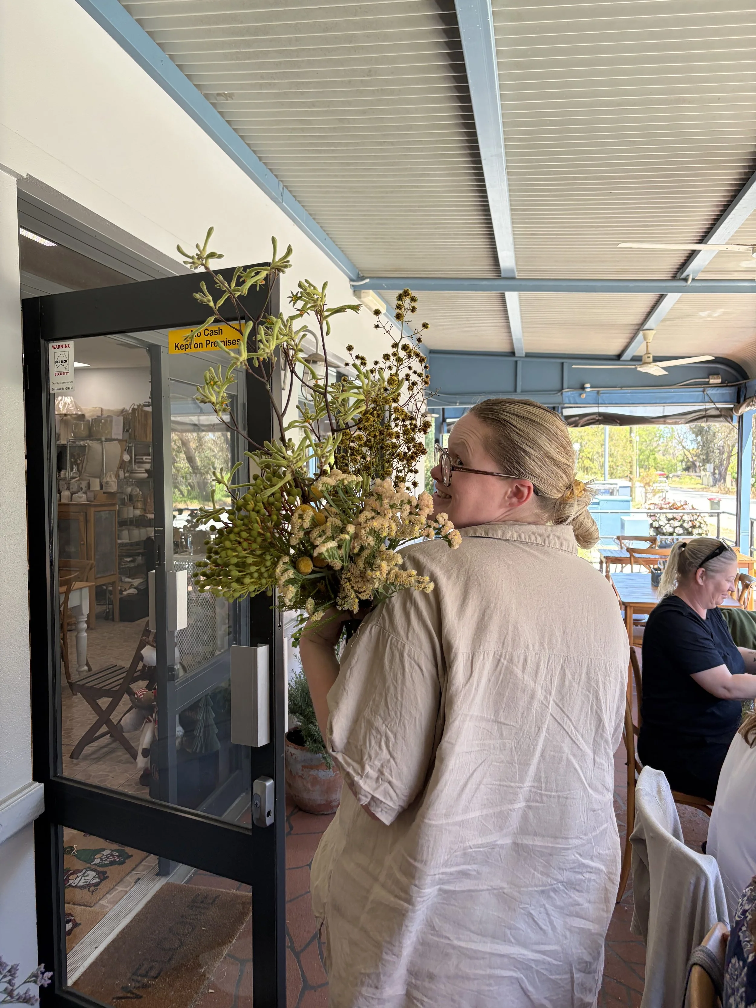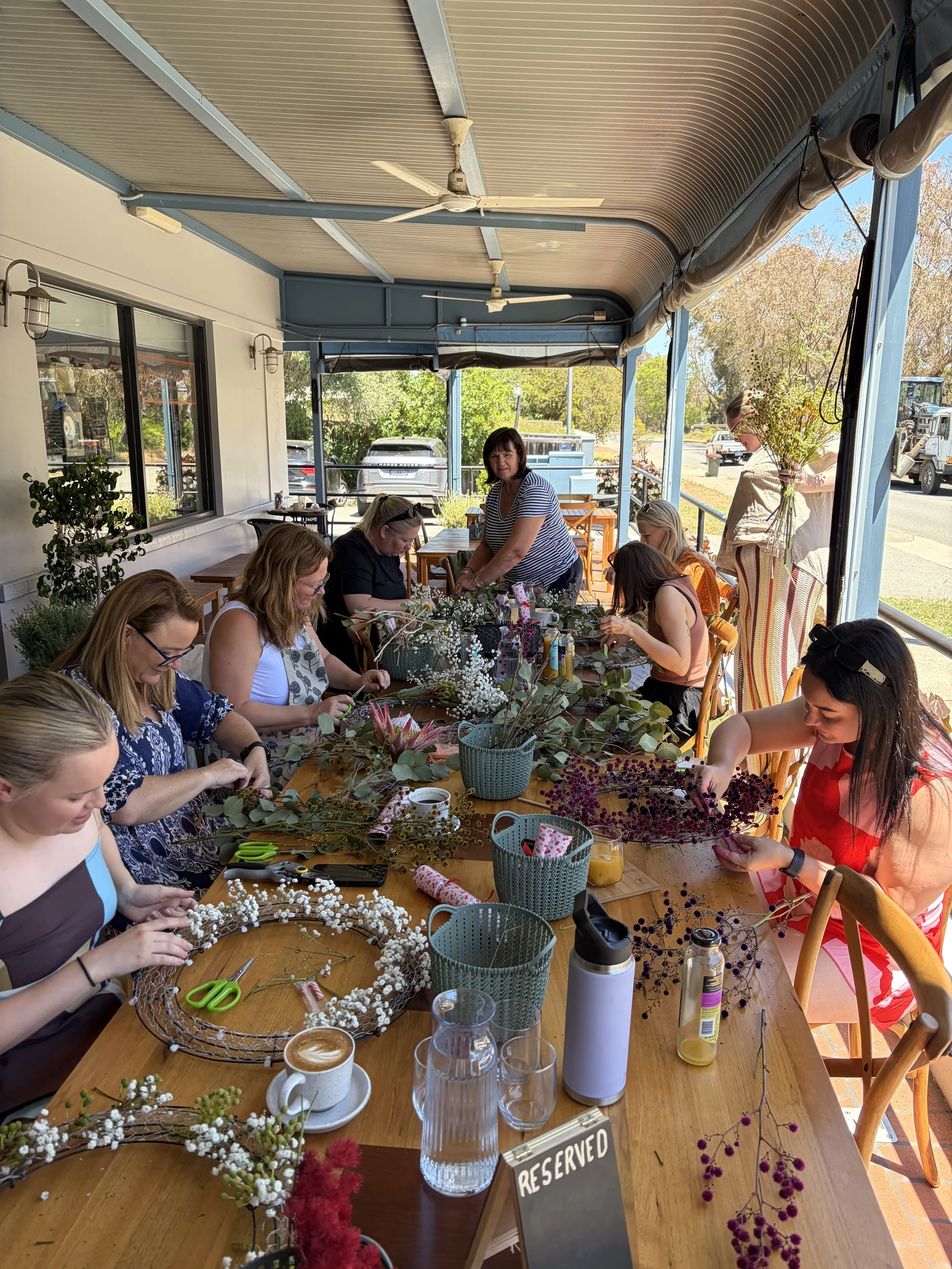 This year our wreath workshop was held at the beautiful Mostyn and Frankie cafe; a beautiful hidden gem in North Yunderup. We enjoyed coffee, tea, juice and treats as 11 of us created our wreaths on their gorgeous patio, overlooking a glorious nature reserve.